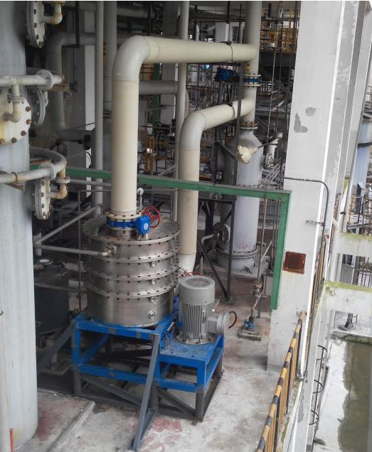 廢氣通過氫氧化鈉堿洗塔后,硫化氫能和堿液反應生成硫化鈉和少量硫氫化鈉,從而達到脫除硫化氫的目的。但當硫化氫濃度低于2000ppm時,堿洗塔很難繼續吸收硫化氫,堿洗效果會變的越來越差差,通過增加多級堿洗還是很難達到排放標準。現采用根據超重力原理所研發的截流式濕法脫硫設備替代原先的塔后(設備型號為LJ1100Ⅳ),將原先硫化氫含量1500ppm降低到20ppm以下,處理量達到3500m³/h以上。